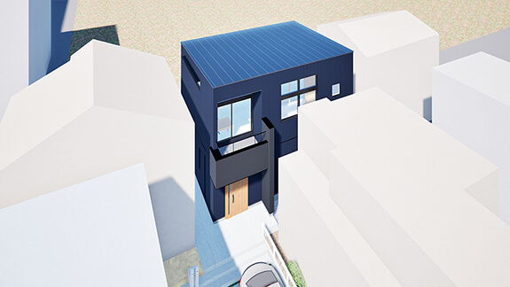 こちらは外観の鳥瞰パースです。周囲は2階建ての住宅に囲まれた環境で、建物のボリュームや配置、隣地との関係性が分かるようにしています。