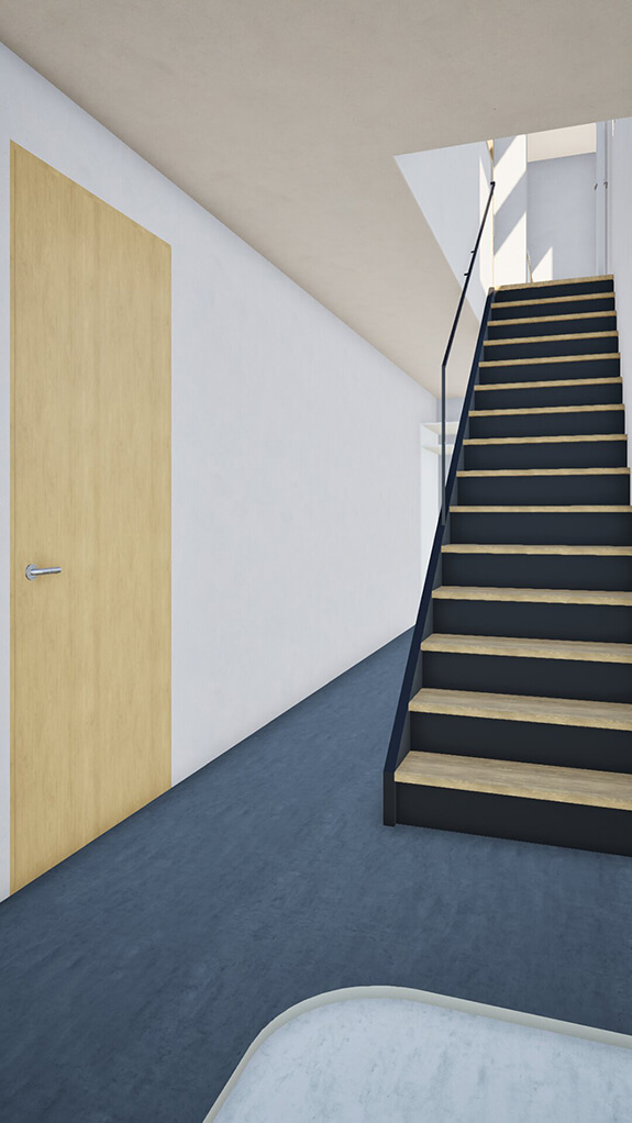 玄関ホールです。正面にはアトリエBへとつながるドアを配置しています。右手には階段があり、その途中に設けた大きな窓から光が差し込み、玄関ホール全体をやわらかく明るく照らします。コンパクトな空間でありながら、光の取り込み方によって広がりを感じられる計画としています。