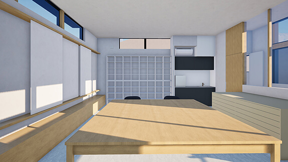 実施設計で決定した内容をもとにCGパースを作成し、それを見ながら建て主の方と空間のイメージを共有しています。図面だけでは伝わりにくいスケール感や色や素材の印象、光の入り方などを視覚的に確認しながら、認識のズレがないようすり合わせを行っています。