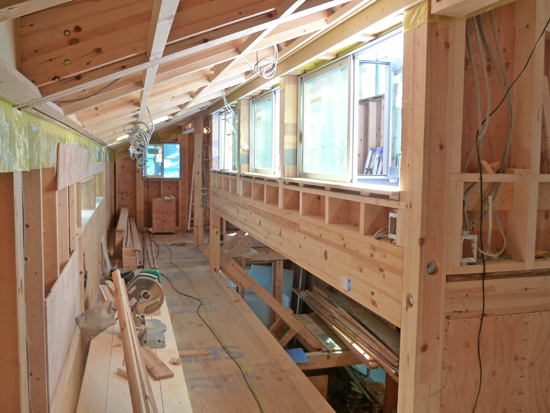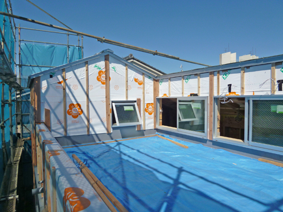 この建物の外壁は耐火等級4(最高等級)をとっており、外壁には厚さ12.5mmのプラスターボードを2枚重ねで張ります。黄色のシートは気密シート。