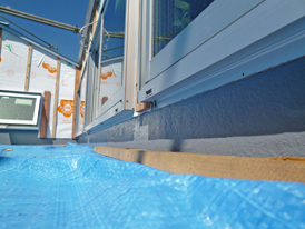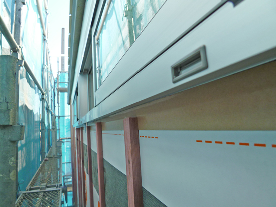外壁に付く窓廻りの防水確認。窓の下側に見えるグレーのシートは、サッシ下端の裏側に発生することがある結露の対策用の防水シートです。