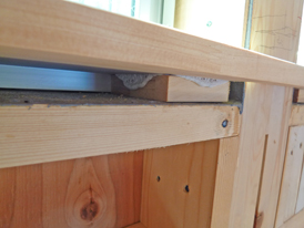 タテ胴縁がサッシ下端と隙間をあけて施工され、外壁通気の流れが阻害されないことの確認。