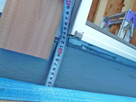 サッシ下端の防水の施工状況。防水立ち上がり高さが、サッシ下端で規定の12cm以上あることを確認。
