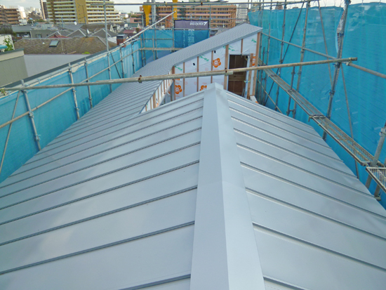 屋根はガルバリウム鋼板の竪ハゼ葺きですが、今回はキャップ式でハゼ締めが不要な、セキノ興産の立平ロック20型を使用しています。