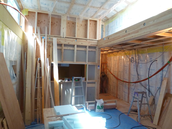 引き続き、建物全体を見てまわって施工状態を確認し、これから施工を行なう階段廻りの打合せを行ないました。