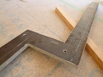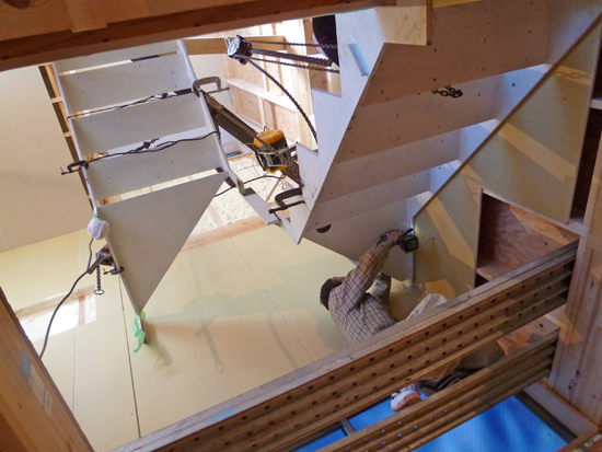この住宅は準耐火構造で階段には30分耐火が要求されるため、踏み板はスチールプレートの上に木の集成材を貼ります。その分、耐火要求のない鉄骨階段に比べ、重くなるので吊り込みにはジャッキを使っています。