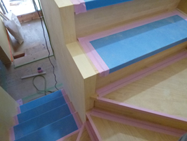 1階〜2階への木製階段もできました。中央の壁を薄く作ることで、階段の有効幅を少しでも広く確保しています。(有効幅80センチ)