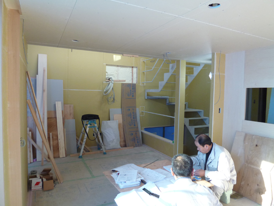 『みんな集まる家』の現場監督さん(伊藤工務店・水元氏)、大工さんと造作家具の打合せをしました。
