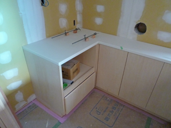 キッチンは人造大理石のカウンター。面材はシナ合板のウレタン塗装仕上です。