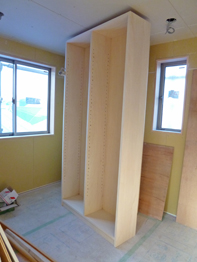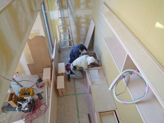 『みんな集まる家』では、家具屋さんや大工さんと打ち合せを重ねた家具が現場に搬入され、組立て・取付けがはじまりました。