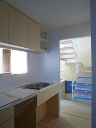 焦げ茶色の家具のある壁面はこれから珪藻土で仕上げます。右側はキッチン。
