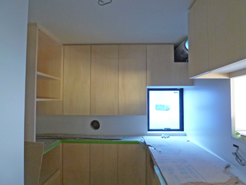 家具工事で作ったキッチン。人造大理石のカウンターがコの字に廻ります。