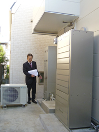 裏庭に設置した家庭用燃料電池エネファーム。設置スペースや勝手口との関係から、貯湯ユニット(右側)と燃料電池ユニット(中央)を放してレイアウトしています。試運転に来られた東京ガスの工事店の方から配管やメンテスペースのことなど、エネファームの簡単な説明も受けました。