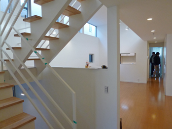 階段手すりに貼られている青いテープは工務店の事前チェックで貼られたものです。黄色のテープの箇所を加えて、お引き渡し前の第二回目の検査までに修正していきます。