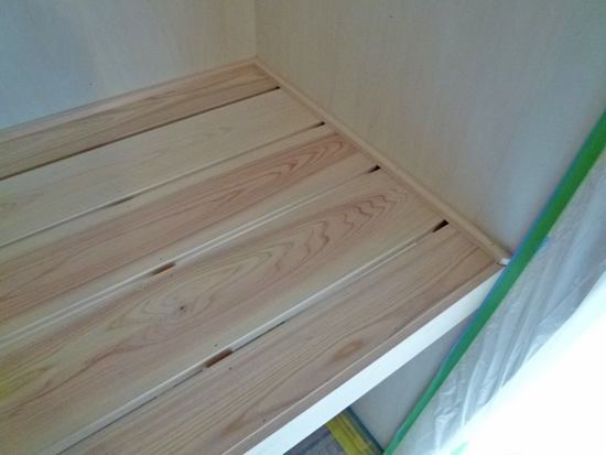 布団を入れる収納の棚は、ヒノキ板を簀の子状にはり、湿気が抜けるようにしています。