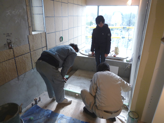 在来工法の浴室のタイル貼について、現場監督さん、タイル屋さんと細かな納まりの打ち合せ中。