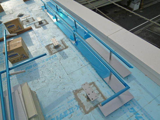 屋上では、手すり壁の工事が始まっています。階段や屋上の手すりは、高い所が苦手なご主人に配慮したデザインです。