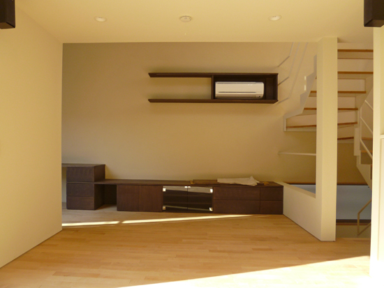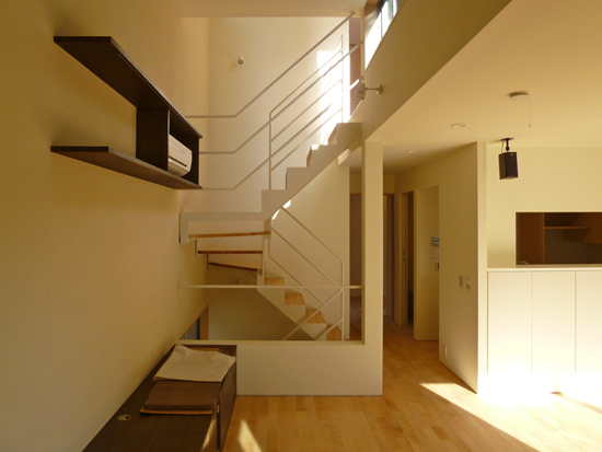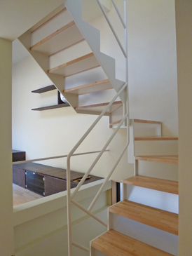 階段には小物を飾れるニッチがあります。右は大工+建具工事で作った鏡の付いた下足入れ。