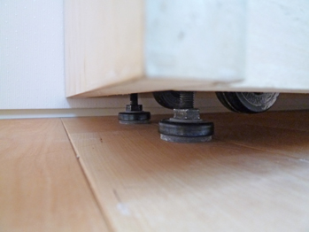 姉妹の部屋のクローゼットと本棚は可動式。下部にキャスターとともにアジャスターを仕込んで、地震時にも動かないようにしています。右写真は、アジャスターが延びて、キャスターが床から浮いているところ。すき間には、後からホコリ止めの幅木を差し込みます。