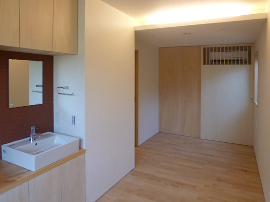 右側は専用の洗面コーナー。カウンターには”裁ち板”を再利用した部分です。