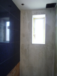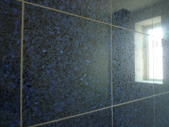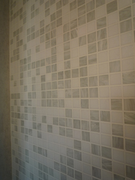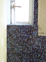 水廻りには青色系の12角のガラスモザイクタイルを、洗面室とバスルーム一体感を強めように片側の壁に貼ります。