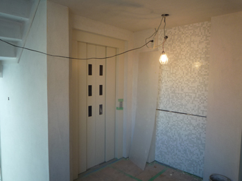 現場ではその ” 色 ” の主要な要素であるガラスタイルが貼られ、それぞれの場所が変化しはじめました。
