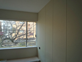 ウオークインクローゼットの壁は、模様が入った紫がかったピンクの不織布です。