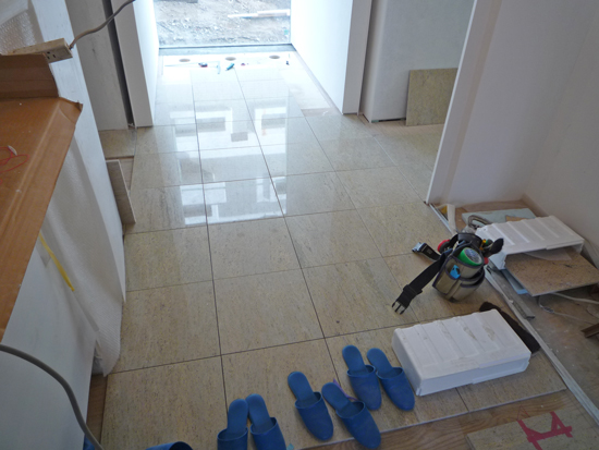 玄関ホールの御影石は、貼る前に敷き並べて石目の見え方などを最終確認。