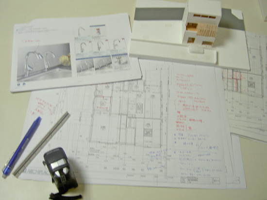 各部屋の展開図や造作で作る家具図をお見せしながら、洗面カウンターの材質、浄水器のシーガルフォーのと水栓金具の関係、収納棚の枚数、床のフローリングの貼り方など、細かな点を一つひとつ打合せしていきました。
