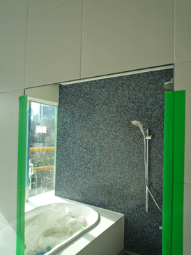 浴室や2階洗面コーナーには鏡が付きました。壁面から出っ張らない枠の無い納まりなので、鏡に映った像がすぱっと切り取られる感じです。