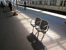 右は、以前から気になっていた、和光市駅(東武東上線)のホームの中央に設置された二人掛けのベンチ(椅子)です。これもある意味「勇気のベンチ」ですよね?