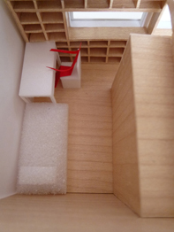最上部には本棚を造り付けた2つの子供室が対称に並んでいます。床、壁、本棚をロシアンバーチの積層板で作ります。