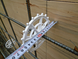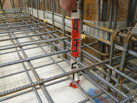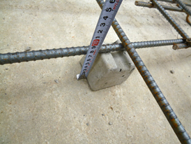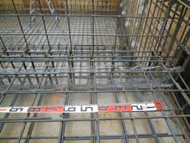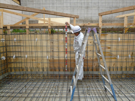 地中梁の外側かぶり厚(60)、梁主筋の定着長さ、止水板の設置を確認