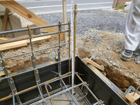 玄関廻りの基礎配筋も確認。コンクリートは1回目で水平部分(耐圧版)のみ打設し、2回目で垂直部分(地中梁、立上り基礎)を打設します。