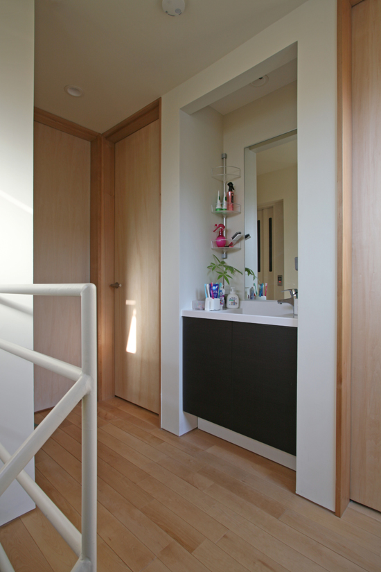 3階子供室前の洗面コーナー 手前にバルコニーへの出入り口がある。