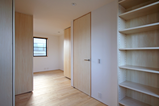 姉妹の部屋 キャスター付きの天井までの可動家具(本棚とクローゼット)で将来仕切ることができる 可動家具の塗装は建て主の自主施工