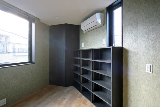 三角形平面の長男の部屋 本棚やクローゼットの塗装は建て主の自主施工