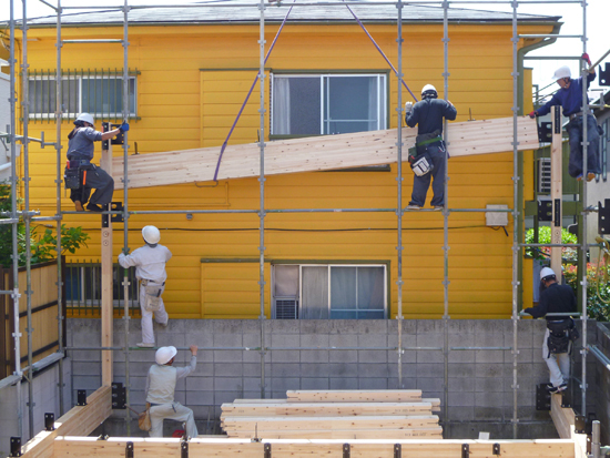 狭いスペースですが、職人さん達の息を合わせた手際よい作業で、着々と組み上がっていきます。