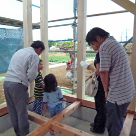工事の安全を祈願して上棟を祝い、最後に棟梁・大工さん、工務店の方々みんなで記念写真を撮りました。