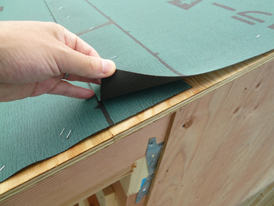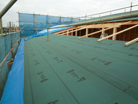 傾斜した大屋根にはアスファルトフーリングが貼られました。重ね幅を確認。