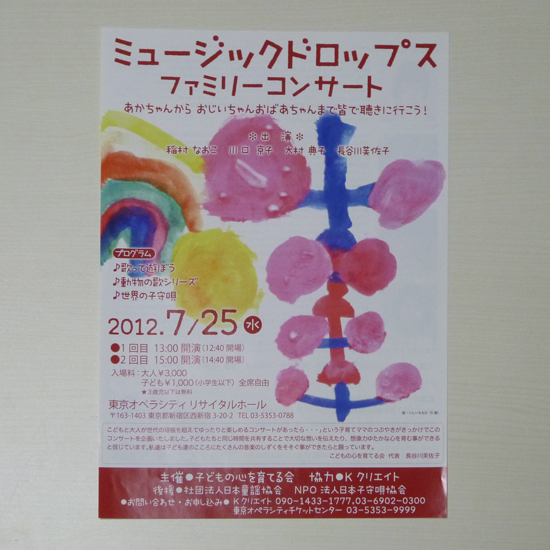 子育てをしていて小さい子どもでもいい音楽をちゃんと受け止めて聴く力があることに気付きました。そして小さい子どもも一緒に家族で楽しめるコンサートがあったら・・と考えていたところ協力してくださる方のおかげで「子どもの心を育てる会」を立ち上げ、7月の25日に「ミュージックドロップスファミリーコンサート」という0才から入場可能なコンサートを東京オペラシティ リサイタルホールにて開催いたします。子どもたちに音楽のしずくをそそぎ心を育てることができたらとの想いで、「ミュージックドロップス」というタイトルを付け「子どもの心を育てる会」としての第一歩のコンサート、皆様どうぞお誘い合わせの上、ご来場お待ちしております。