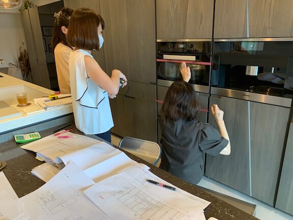 家電置場の高さも確認しました。一番良く使う電子レンジの高さは、子供たちも使える高さに設定しました。